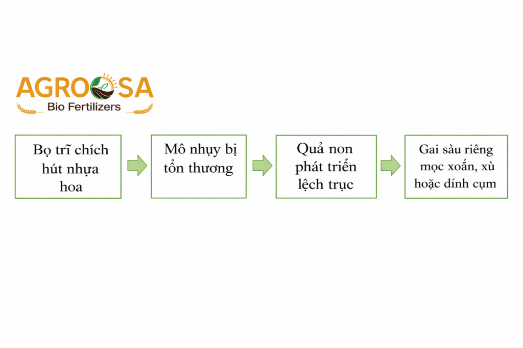Trong giai đoạn hoa nở và thụ phấn, bọ trĩ thường tập trung chích hút nhựa tại nhụy hoa, cánh hoa và cuống hoa, gây tổn thương các mô non đang phát triển. Những vết chích hút này tuy rất nhỏ nhưng lại ảnh hưởng trực tiếp đến quá trình hình thành mô trái sau khi đậu quả. Khi trái bắt đầu phát triển, các tế bào vỏ không lớn lên đồng đều, dẫn đến hiện tượng gai mọc lệch, dính cụm hoặc biến dạng, từ đó hình thành trái sầu riêng mặt quỷ với bề mặt sần sùi và hình dáng méo mó.